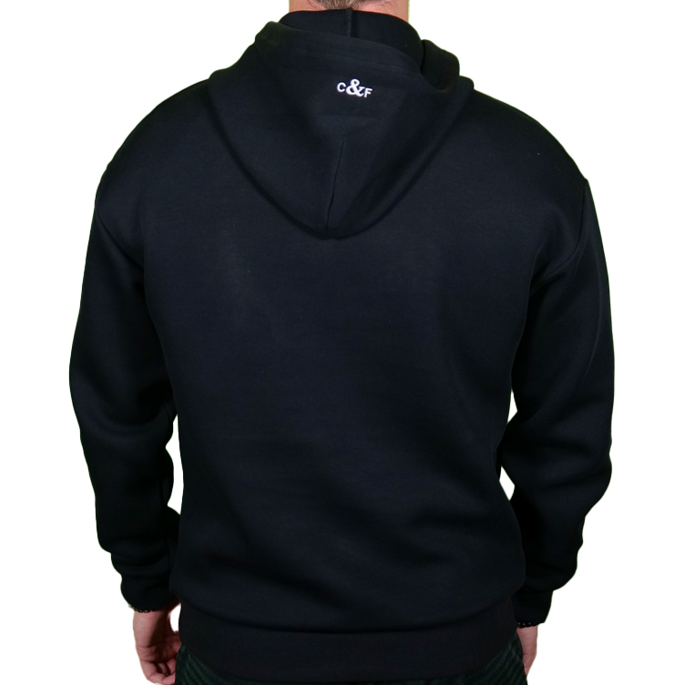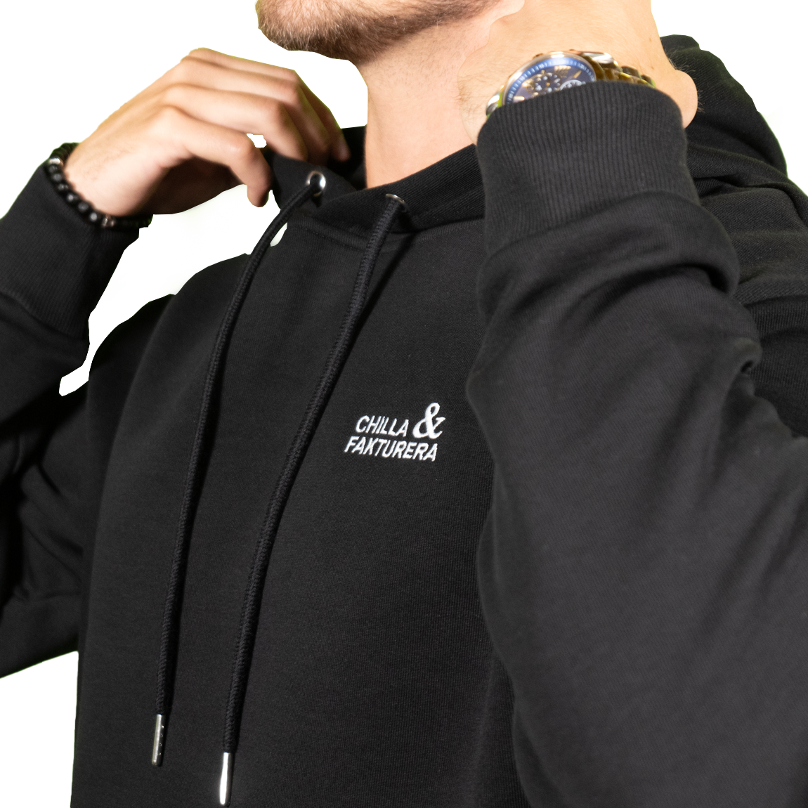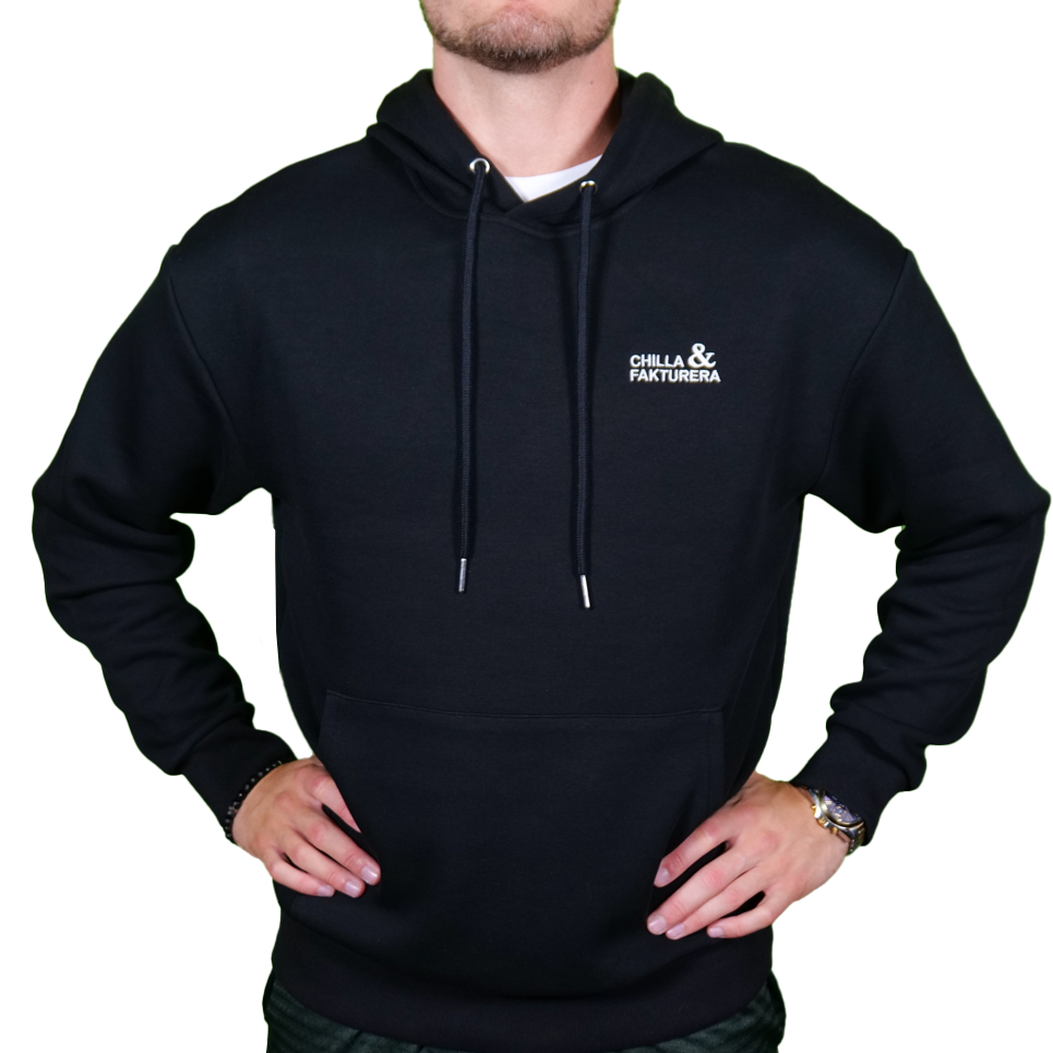 Hoodie med broderad logga i vitt på bröstet.
